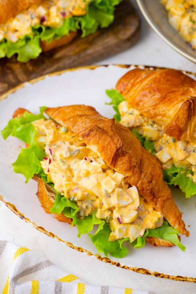 I like to serve my egg salad on croissants or hoagie rolls with baby butter lettuce for a fresh sandwich. But it also tastes superb spread on my freshly baked challah or homemade brioche bread. The rich, buttery bread complements the savory egg filling, creating a blend of sweet, salty, and umami in every bite. For fewer carbs, skip the bread and just serve it on lettuce leaves or use it as stuffing for grilled avocados.