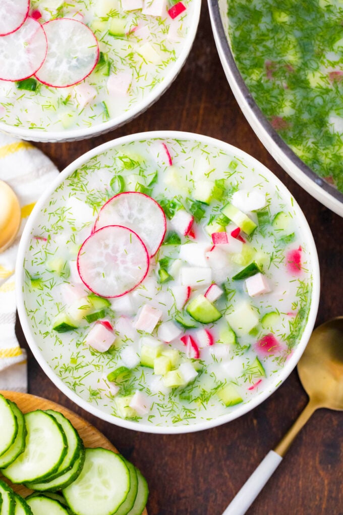 Every summer, without exception, I turn to my favorite cold summer soup, also known as the legendary Russian Okroshka. This soup is a vibrant and delicious blend of a creamy broth, savory ham, aromatic herbs, and crisp veggies like cucumber, radishes, and tender potatoes.