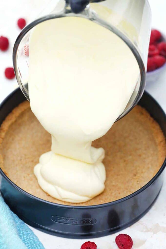 - Transfer the white chocolate cheesecake filling to the cheesecake crust and smooth out the top with an offset spatula.
