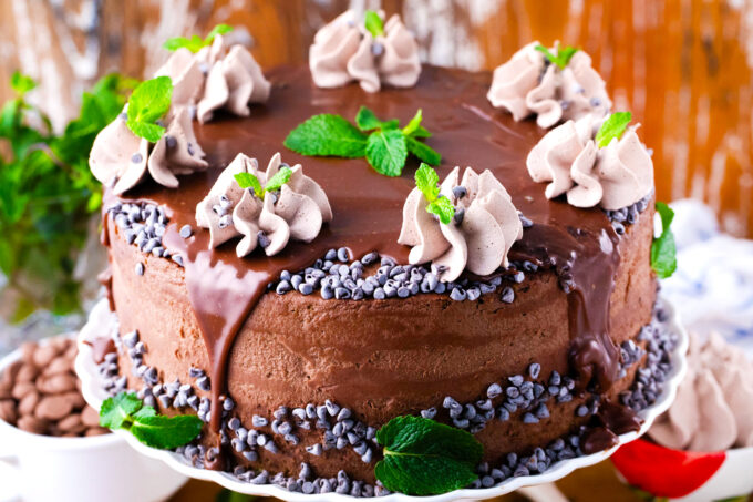 - Chocolate and mint: These 2 flavors taste so good together; it’s such a classic combo that it’s both nostalgic and always on point. The moist minty cake layers, full of mini chocolate chips, are surrounded by thick chocolate buttercream and topped with chocolate ganache and homemade chocolate whipped cream.